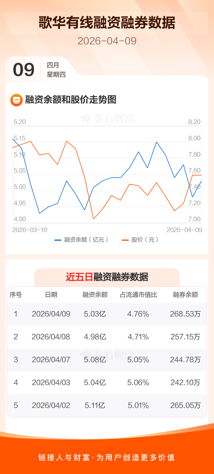 交易所最新数据显示,歌华有线于2026年4月9日获融资买入1759.13万元,融资偿还1187.10万元,当日融资净买入572.03万元。目前,该股融资余额5.03亿,占流通市值比例为4.76%。