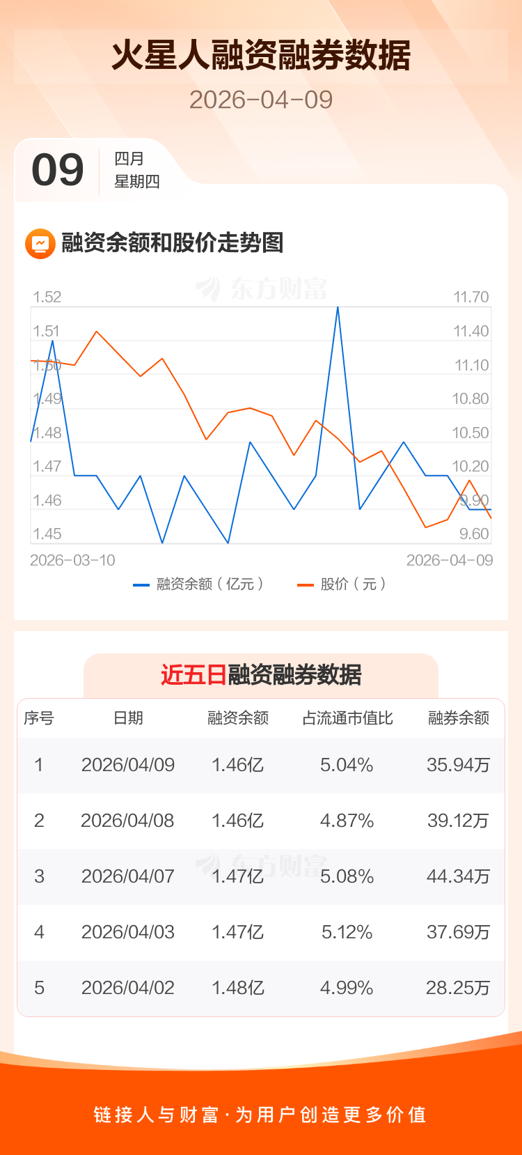 交易所最新数据显示,火星人于2026年4月9日获融资买入412.08万元,融资偿还406.66万元,当日融资净买入5.41万元。目前,该股融资余额1.46亿,占流通市值比例为5.04%。