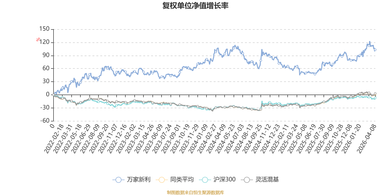 截至4月8日,万家新利近三个月复权单位净值增长率为7.20%,位于同类可比基金152/1287;近半年复权单位净值增长率为13.45%,位于同类可比基金171/1286;近一年复权单位净值增长率为36.62%,位于同类可比基金571/1286;近三年复权单位净值增长率为38.17%,位于同类可比基金236/1286。