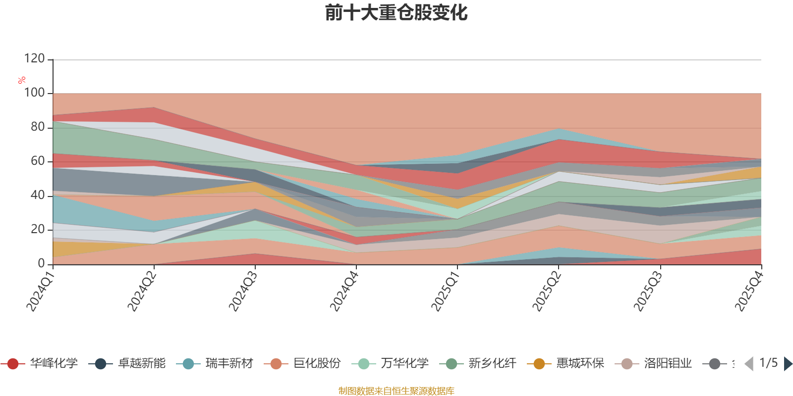 该基金持股集中度较高。截至2025年末,基金十大重仓股分别是华峰化学、巨化股份、三美股份、华鲁恒升、万华化学、恒力石化、新乡化纤、鲁西化工、盐湖股份、新凤鸣。