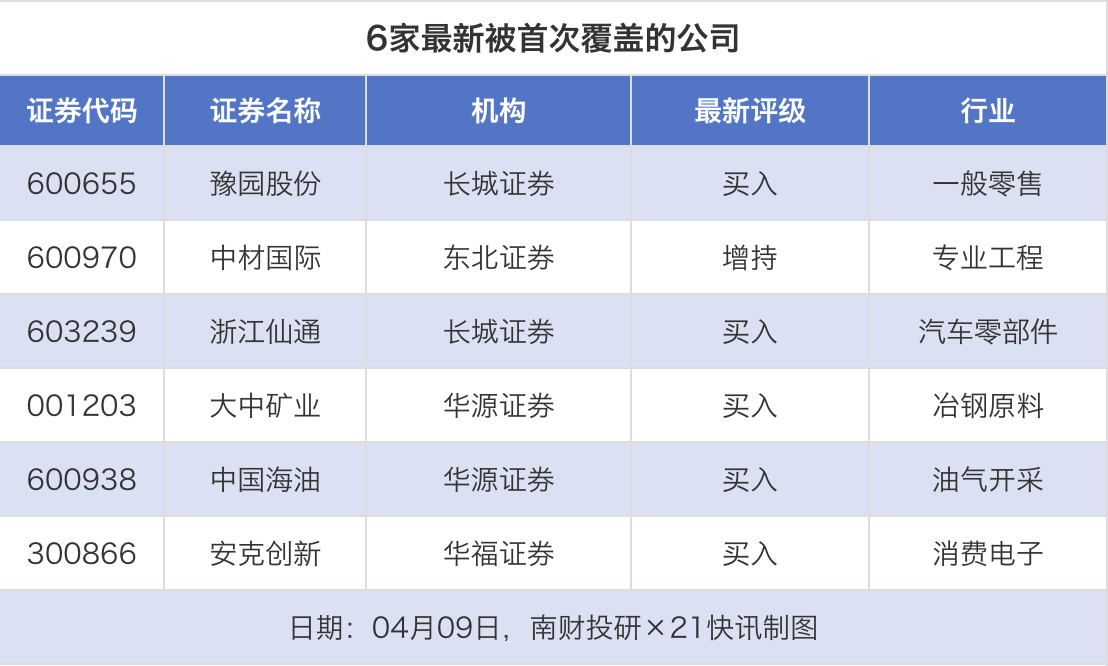 首次覆盖方面,4月9日券商共给出了6次首次覆盖,其中豫园股份、浙江仙通获得长城证券给予“买入”评级,中材国际获得东北证券给予“增持”评级,大中矿业、中国海油获得华源证券给予“买入”评级。
