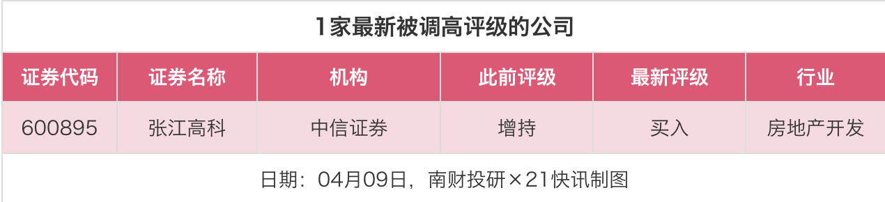 评级调高方面,4月9日,券商调高上市公司评级1家次,中信证券对张江高科的评级从“增持”调高至“买入”。
