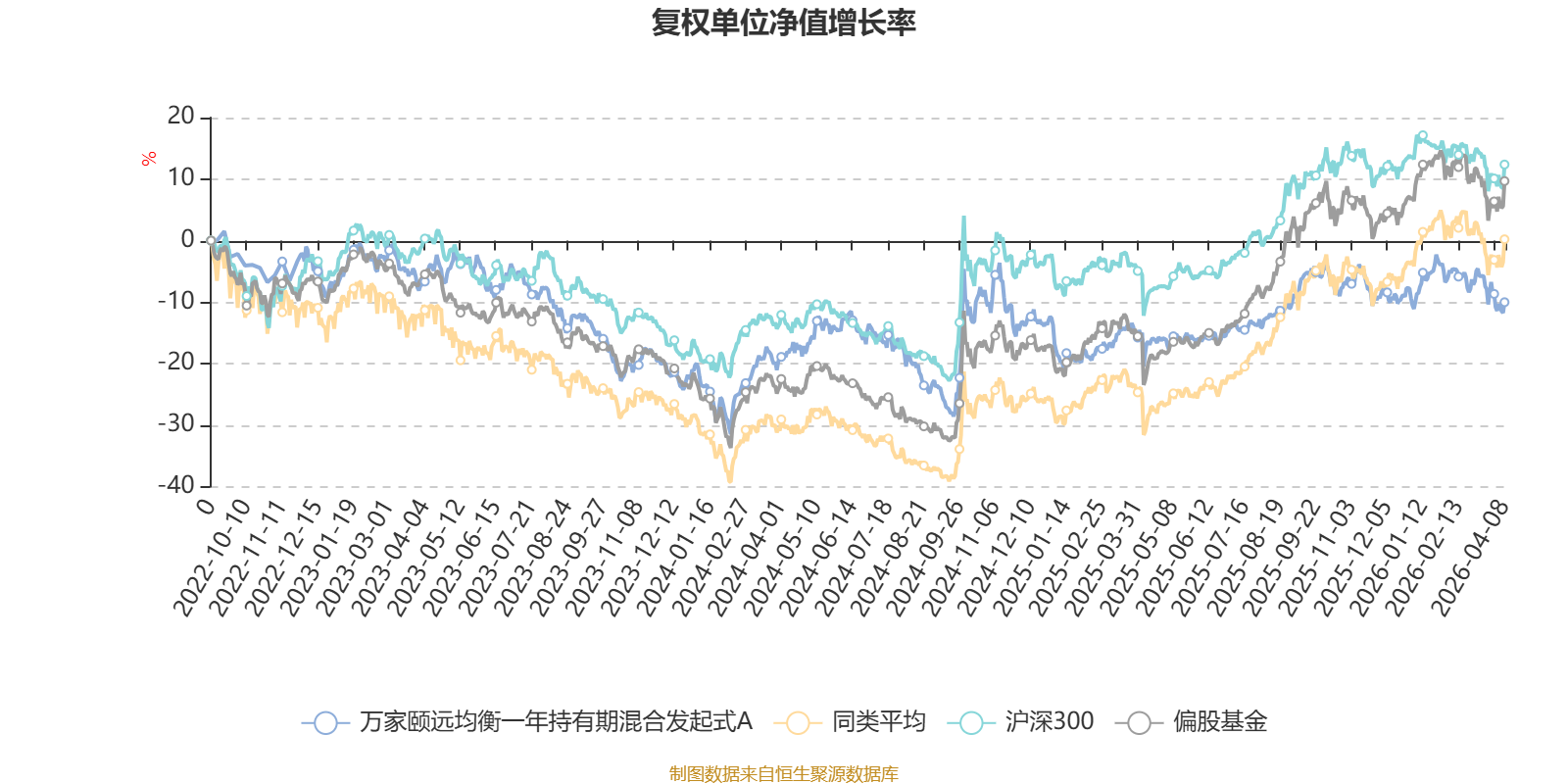截至4月8日,万家颐远均衡一年持有期混合发起式A近三个月复权单位净值增长率为-2.66%,位于同类可比基金416/621;近半年复权单位净值增长率为-5.78%,位于同类可比基金497/621;近一年复权单位净值增长率为10.35%,位于同类可比基金583/618;近三年复权单位净值增长率为-5.25%,位于同类可比基金458/559。