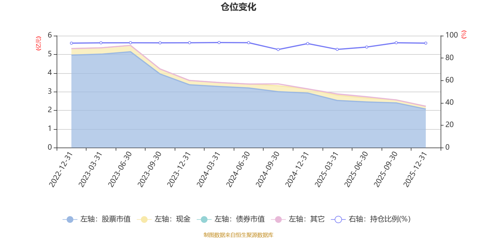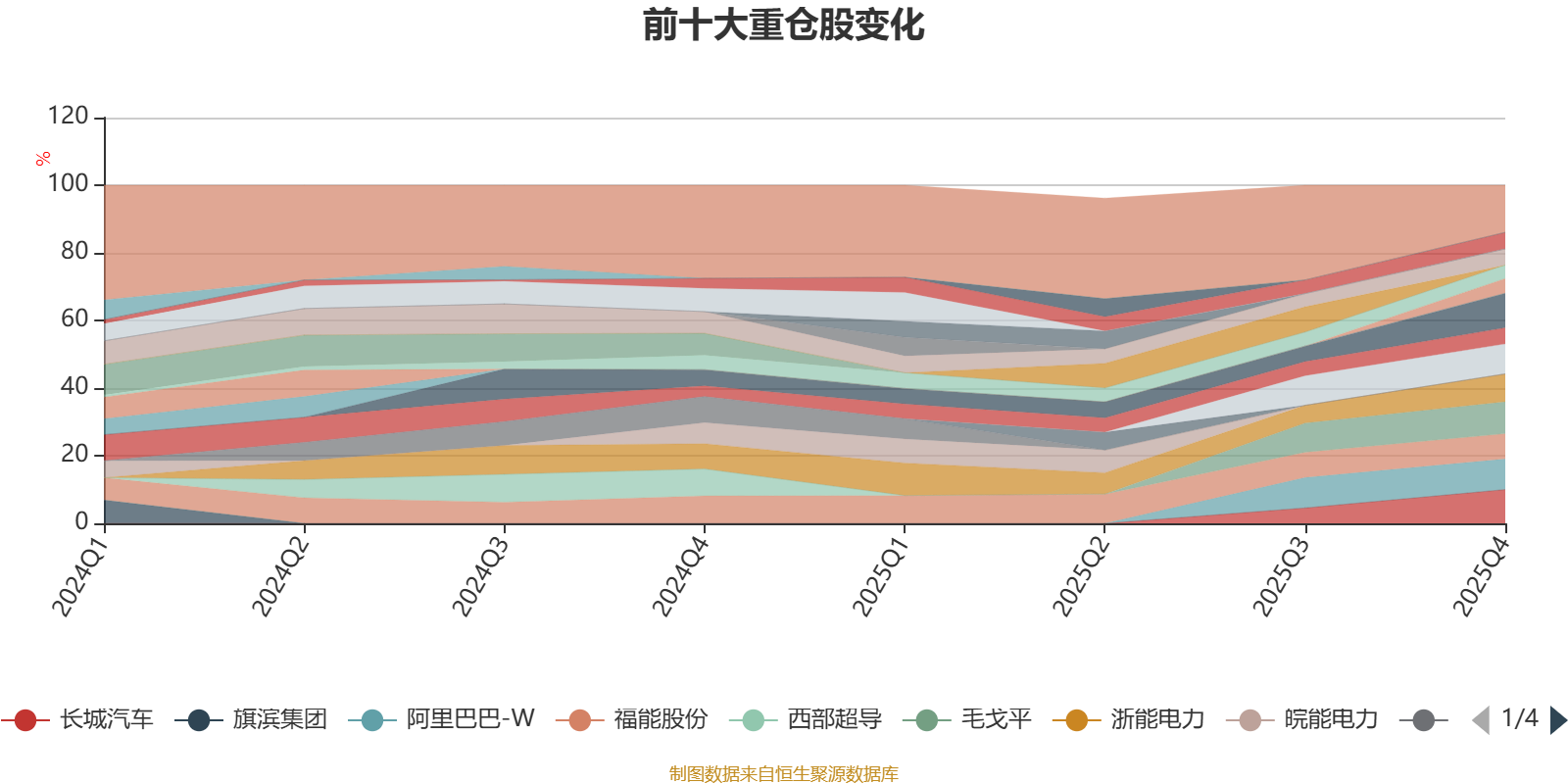 该基金持股集中度较高,近2年前十大重仓股集中度长期超过60%。截至2025年末,基金十大重仓股分别是奥特维、长城汽车、毛戈平、阿里巴巴-W、巨子生物、浙能电力、福能股份、华能国际电力股份、华电国际、国电电力、华电国际电力股份。