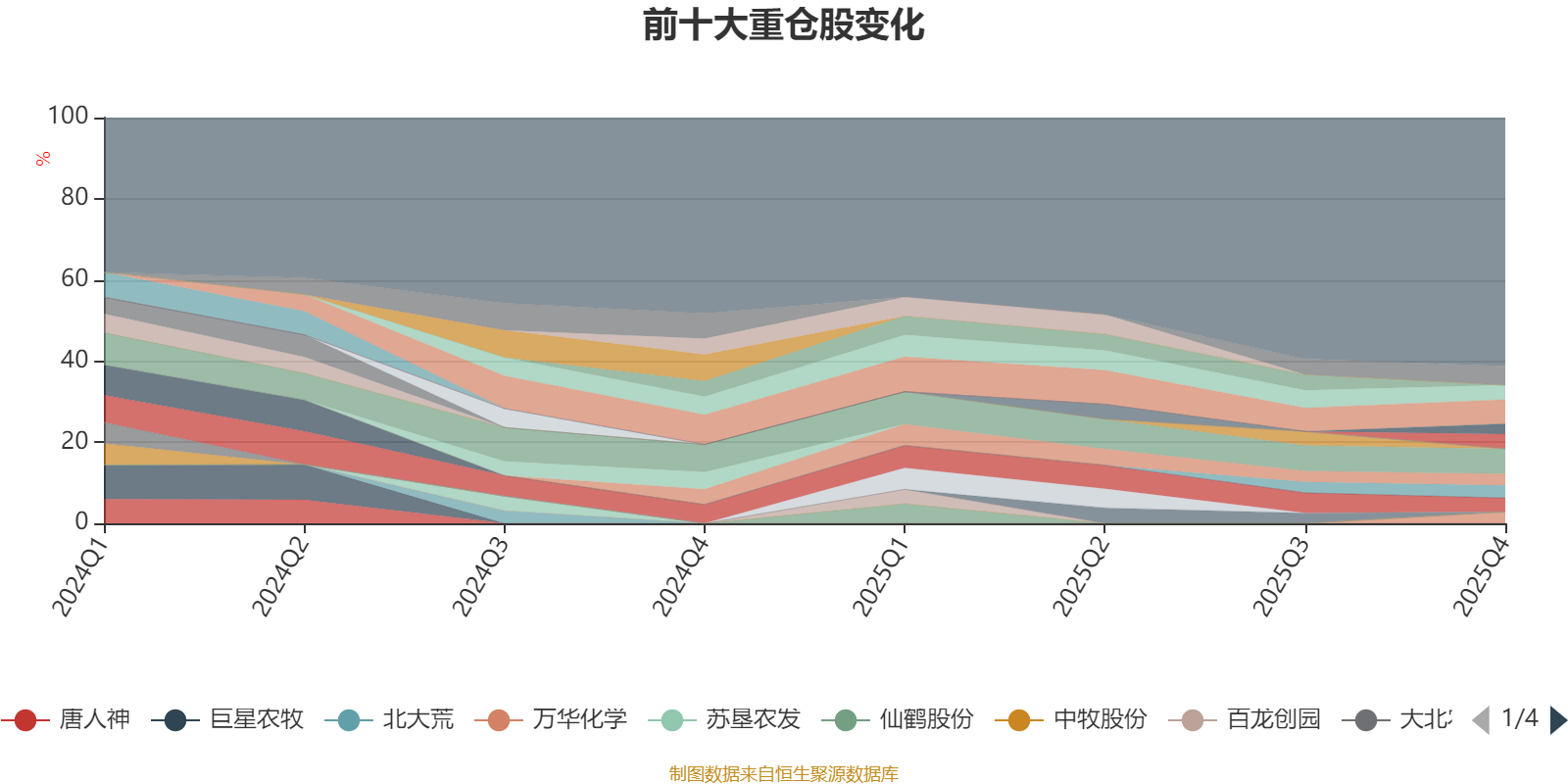 截至2025年末,基金十大重仓股分别是温氏股份、牧原股份、立华股份、伊利股份、安琪酵母、海大集团、史丹利、中宠股份、万华化学、中国石化。