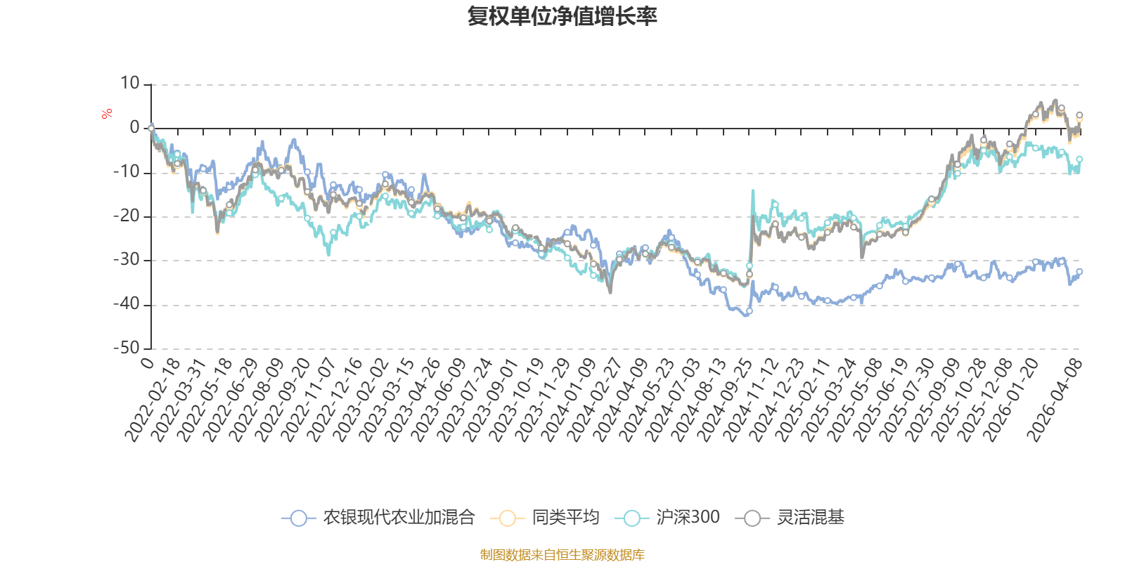 截至4月8日,农银现代农业加混合近三个月复权单位净值增长率为-1.17%,位于同类可比基金802/1287;近半年复权单位净值增长率为1.24%,位于同类可比基金763/1286;近一年复权单位净值增长率为9.38%,位于同类可比基金1071/1286;近三年复权单位净值增长率为-23.57%,位于同类可比基金1234/1286。