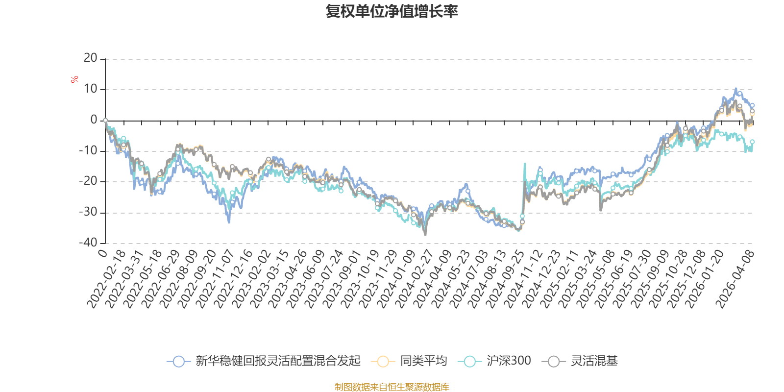 截至4月8日,新华稳健回报灵活配置混合发起近三个月复权单位净值增长率为2.59%,位于同类可比基金355/1287;近半年复权单位净值增长率为6.23%,位于同类可比基金434/1286;近一年复权单位净值增长率为32.89%,位于同类可比基金652/1286;近三年复权单位净值增长率为22.36%,位于同类可比基金461/1286。