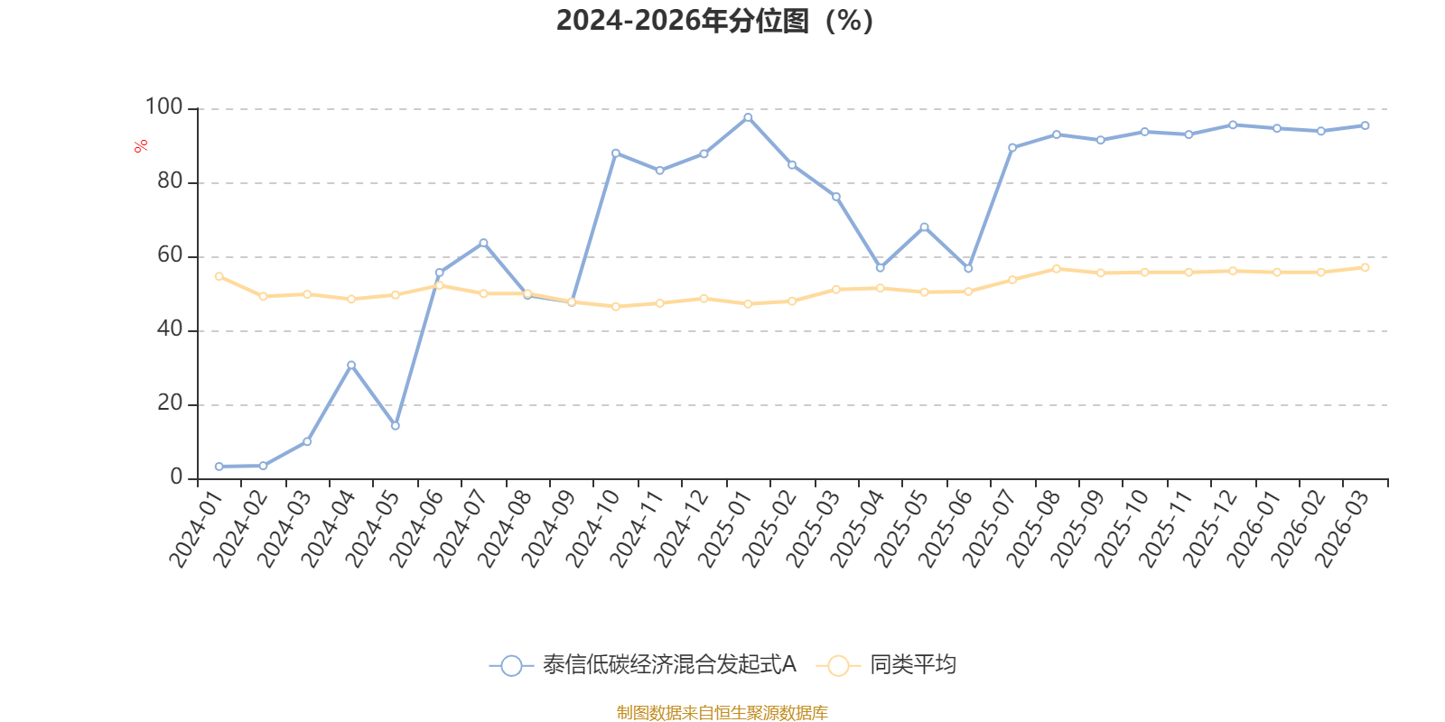 通过所选区间该基金净值增长率分位图,可以观察该基金与同类基金业绩比较情况。图为坐标原点到区间内某时点的净值增长率在同类基金中的分位数。