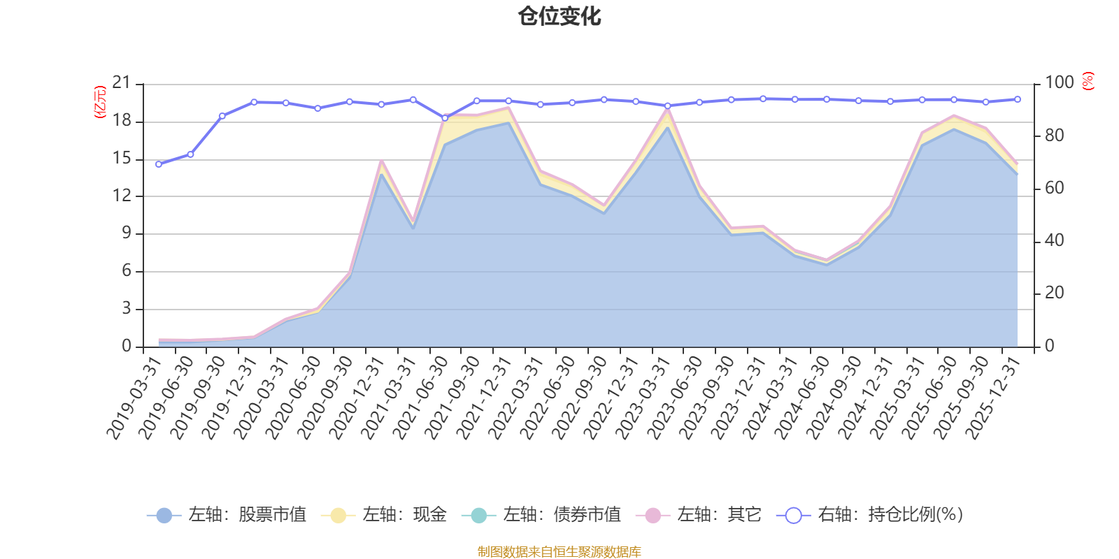 据定期报告数据统计,近三年平均股票仓位为93.61%,同类平均为86.9%。2023年末基金达到94.34%的最高仓位,2019年一季度末最低,为69.45%。