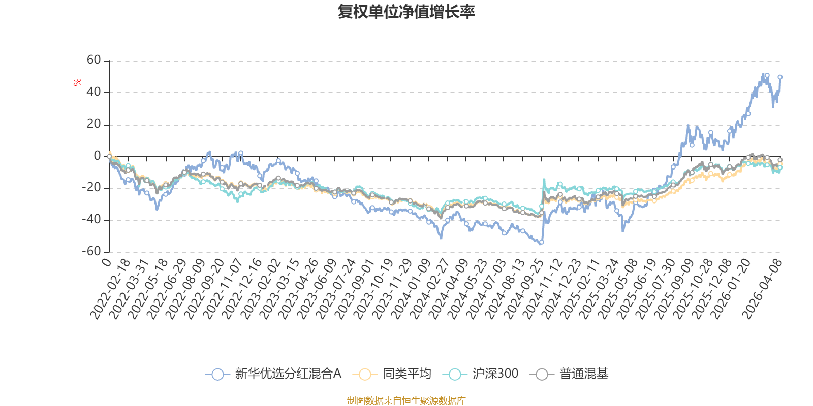 截至4月8日,新华优选分红混合A近三个月复权单位净值增长率为20.16%,位于同类可比基金1/134;近半年复权单位净值增长率为31.66%,位于同类可比基金2/134;近一年复权单位净值增长率为180.32%,位于同类可比基金2/134;近三年复权单位净值增长率为76.31%,位于同类可比基金2/126。