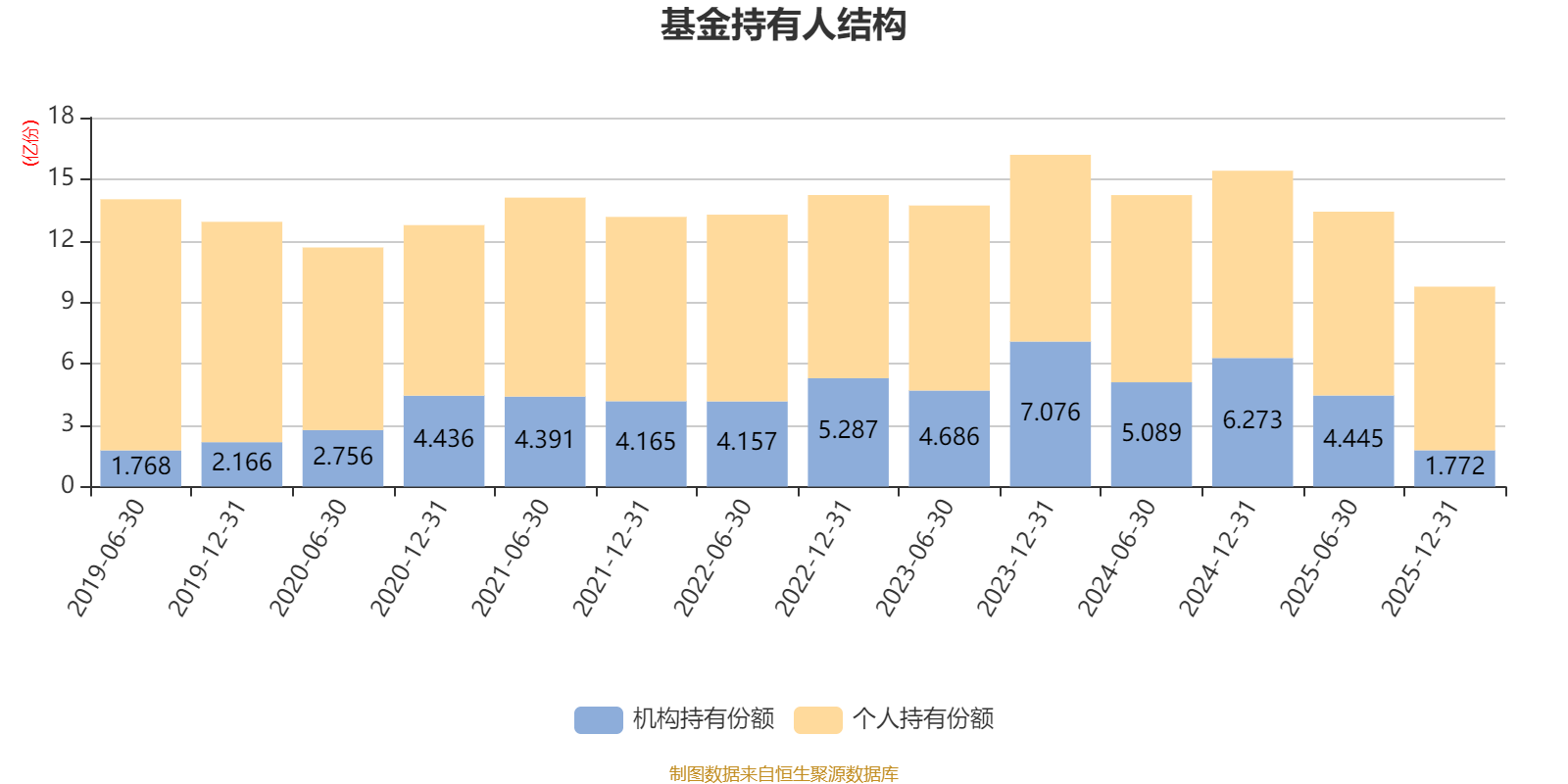 截至2025年12月31日,基金持有人共计3.05万户,合计持有9.75亿份。其中管理人员工持有305.49万份,占比0.31%,机构持有份额占比18.17%,个人投资者占比81.83%。