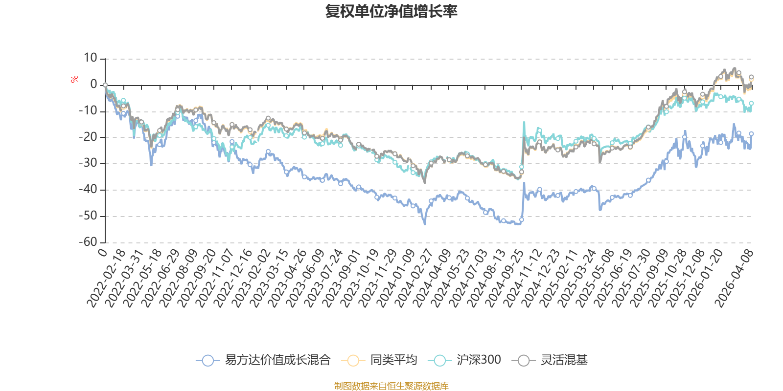 截至4月8日,易方达价值成长混合近三个月复权单位净值增长率为2.66%,位于同类可比基金346/1287;近半年复权单位净值增长率为3.66%,位于同类可比基金572/1286;近一年复权单位净值增长率为55.70%,位于同类可比基金339/1286;近三年复权单位净值增长率为19.06%,位于同类可比基金517/1286。