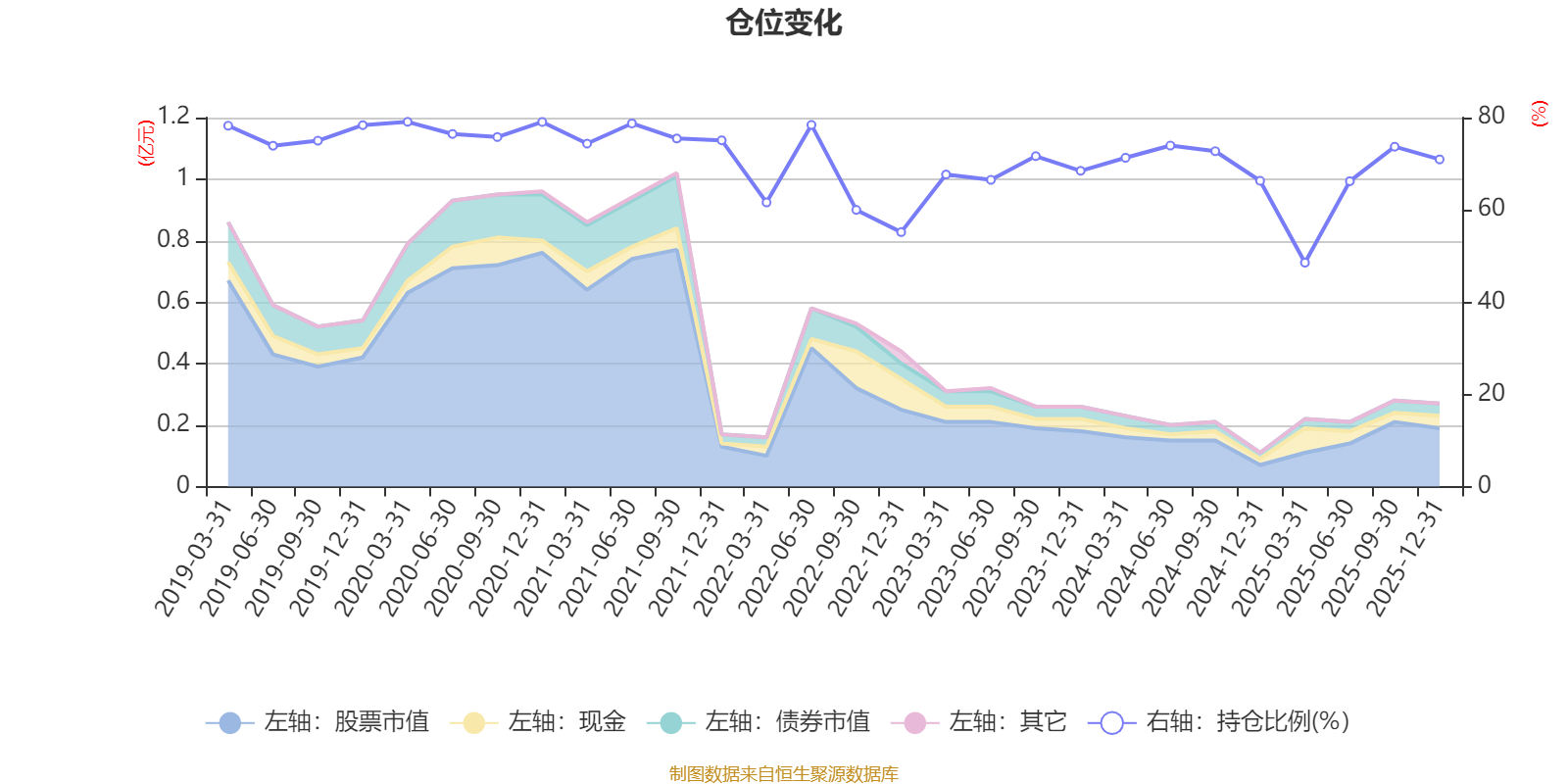 据定期报告数据统计,近三年平均股票仓位为68.16%,同类平均为72.57%。2020年一季度末基金达到79.08%的最高仓位,2025年一季度末最低,为48.55%。