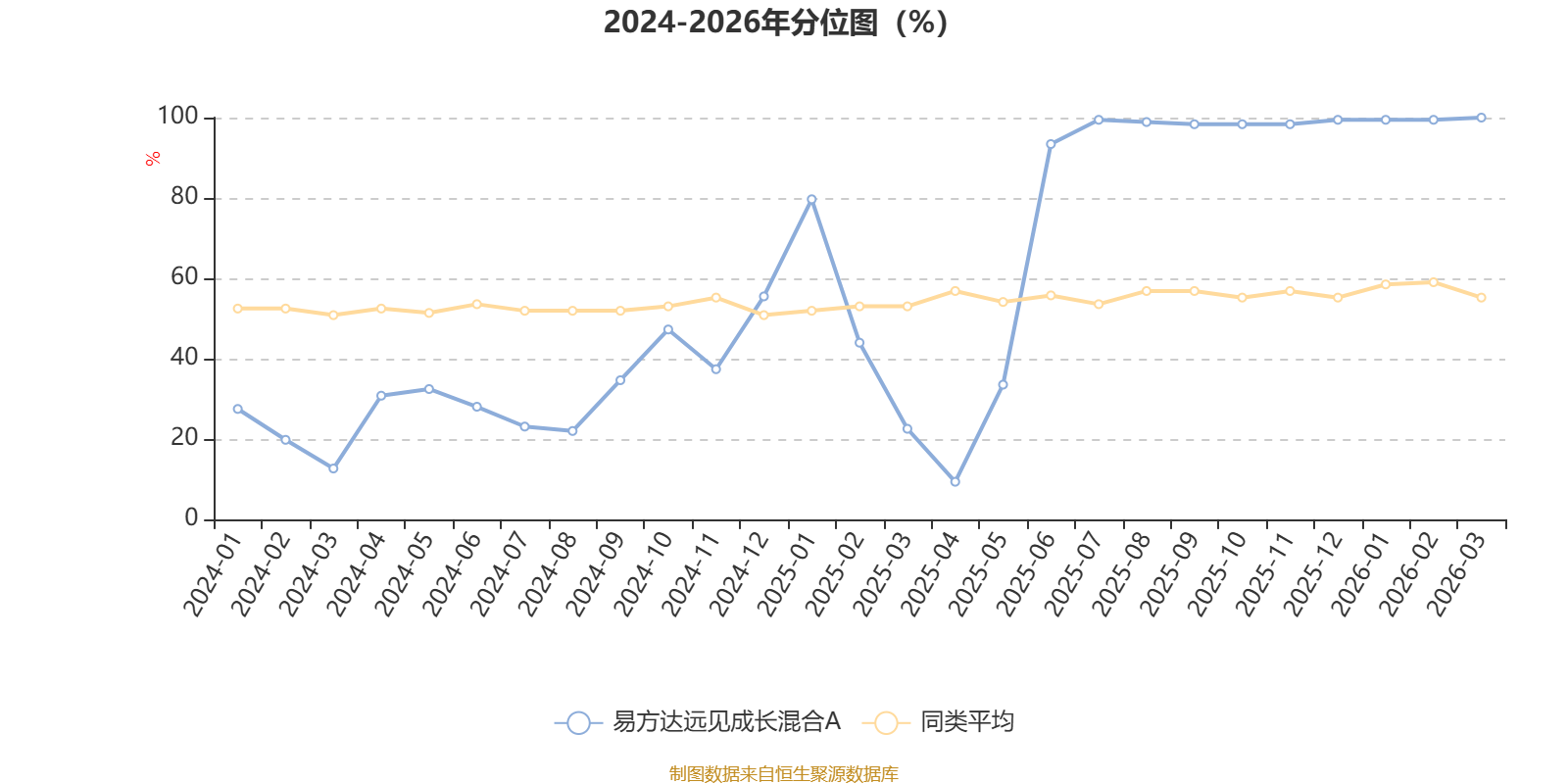 通过所选区间该基金净值增长率分位图,可以观察该基金与同类基金业绩比较情况。图为坐标原点到区间内某时点的净值增长率在同类基金中的分位数。