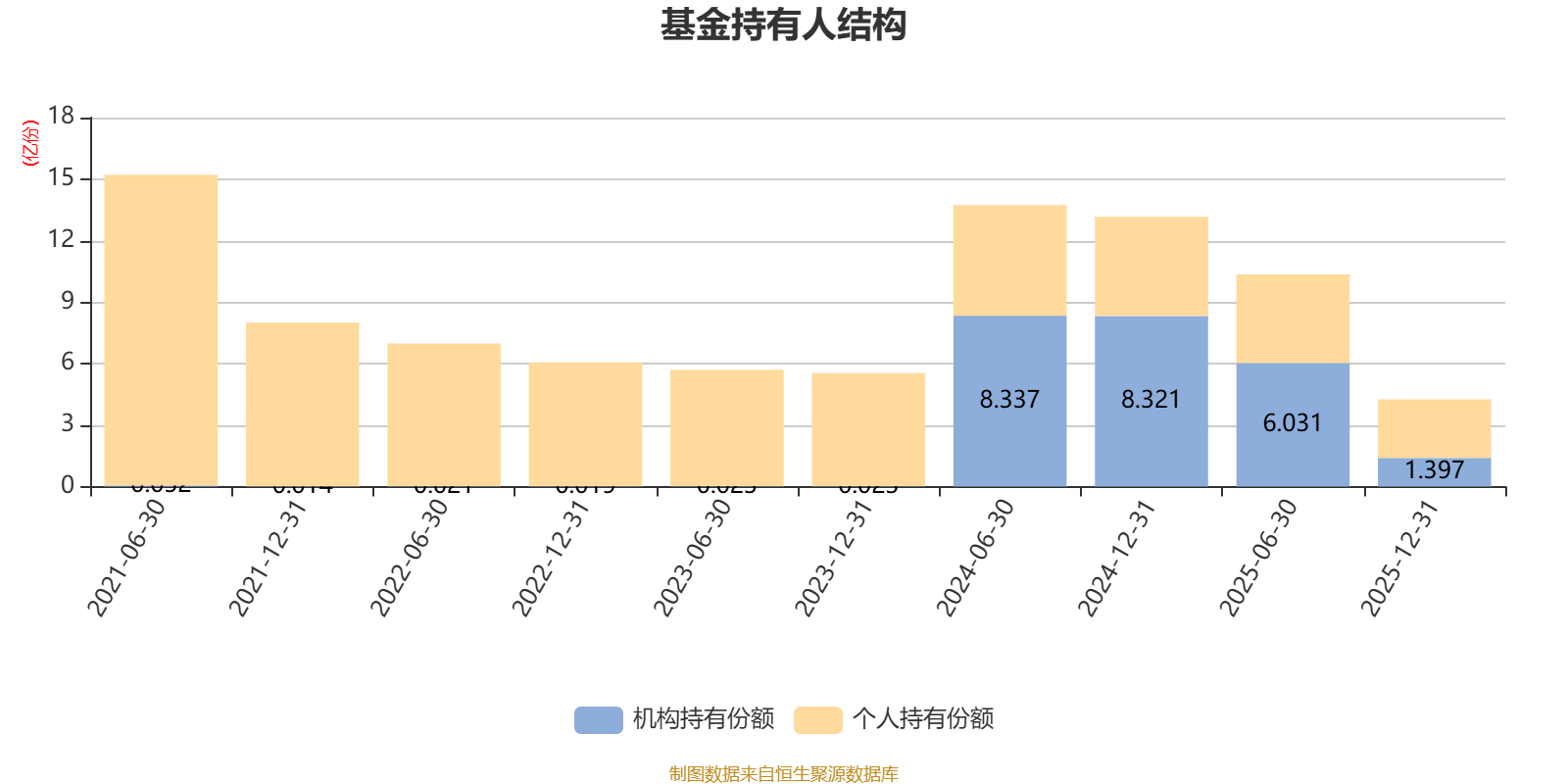 截至2025年12月31日,基金持有人共计1.05万户,合计持有4.25亿份。其中管理人员工持有9.27万份,占比0.02%,机构持有份额占比32.83%,个人投资者占比67.17%。