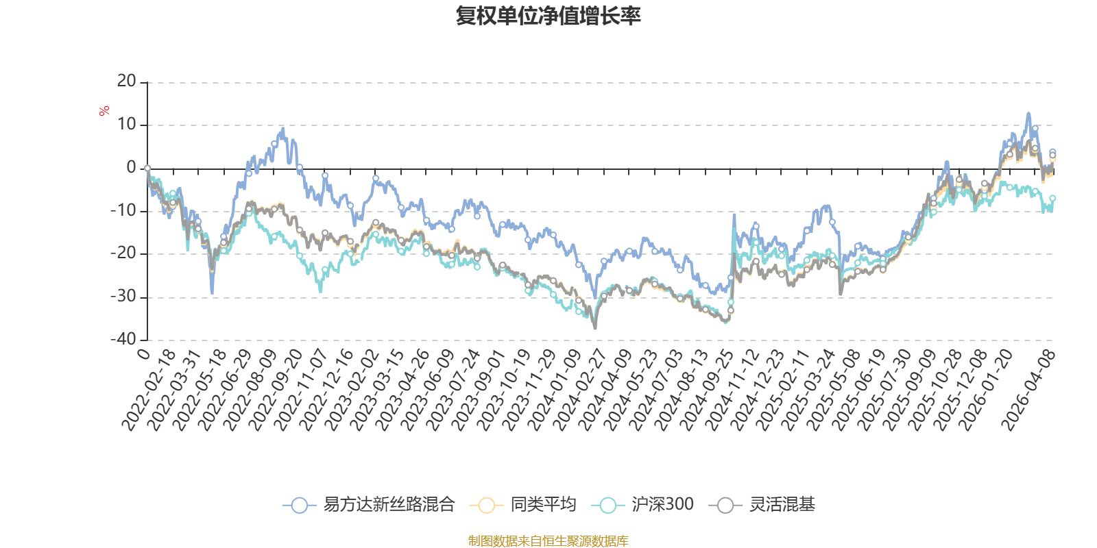 截至4月8日,易方达新丝路混合近三个月复权单位净值增长率为0.28%,位于同类可比基金628/1287;近半年复权单位净值增长率为2.15%,位于同类可比基金686/1286;近一年复权单位净值增长率为40.24%,位于同类可比基金521/1286;近三年复权单位净值增长率为13.86%,位于同类可比基金638/1286。