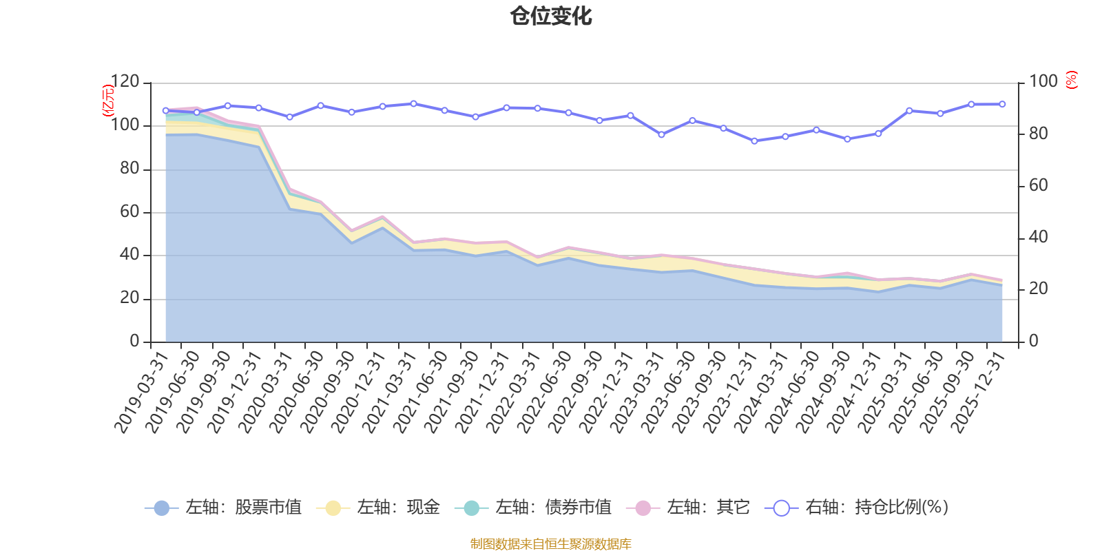 据定期报告数据统计,近三年平均股票仓位为83.8%,同类平均为72.57%。2021年一季度末基金达到91.91%的最高仓位,2023年末最低,为77.49%。