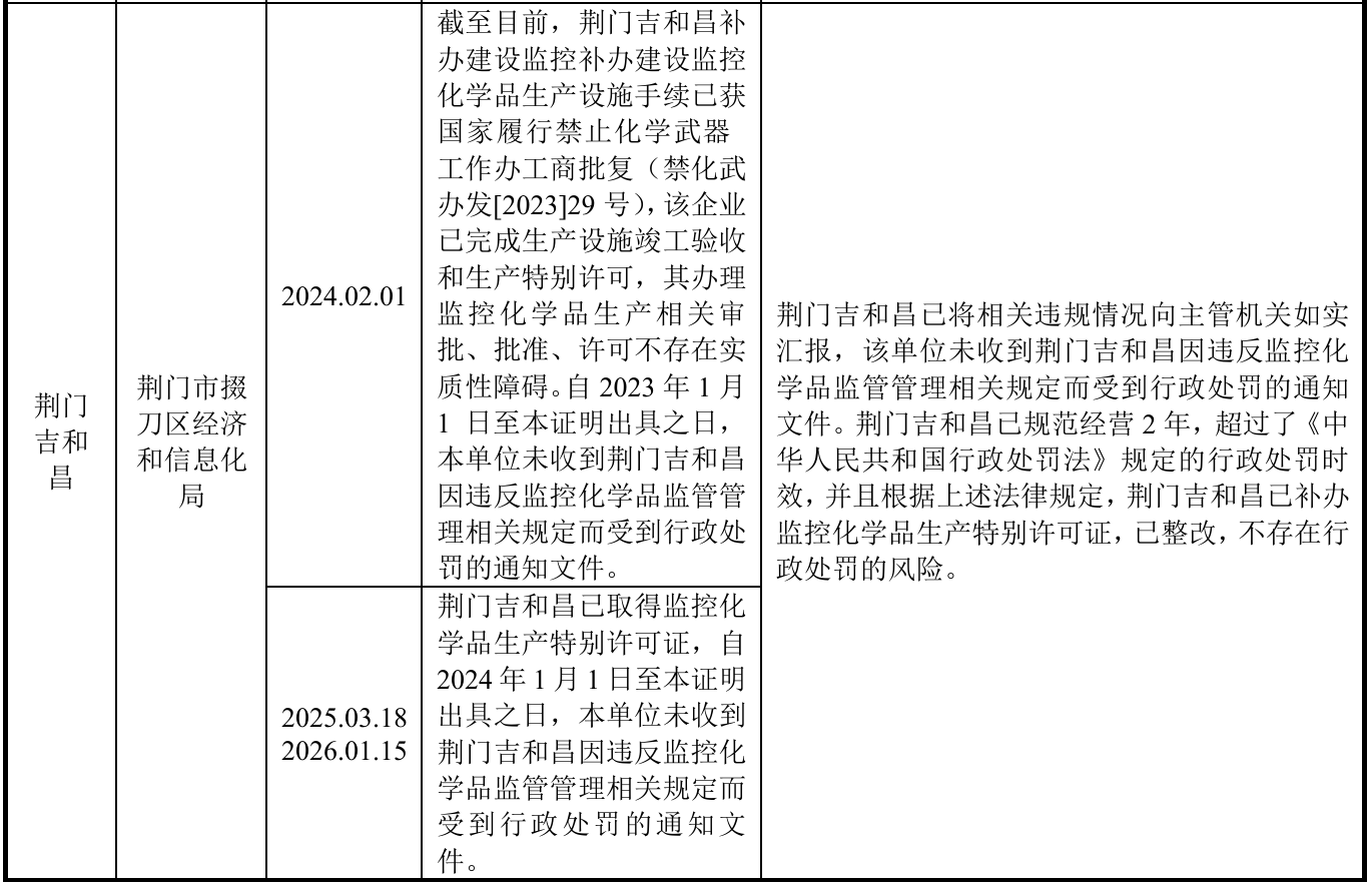 这种对红线的逾越并非仅停留在生产线。武汉国贸、武汉特化及母公司,在2022年至2024年间,均在未取得危化品经营许可证的情况下持续开展贸易活动。资质获取的“时差”同样显著:作为受严格管制的监控化学品,荆门吉和昌的1,3-丙烷磺内酯在长达三年的无证生产后,直到2025年1月才完成手续补办。