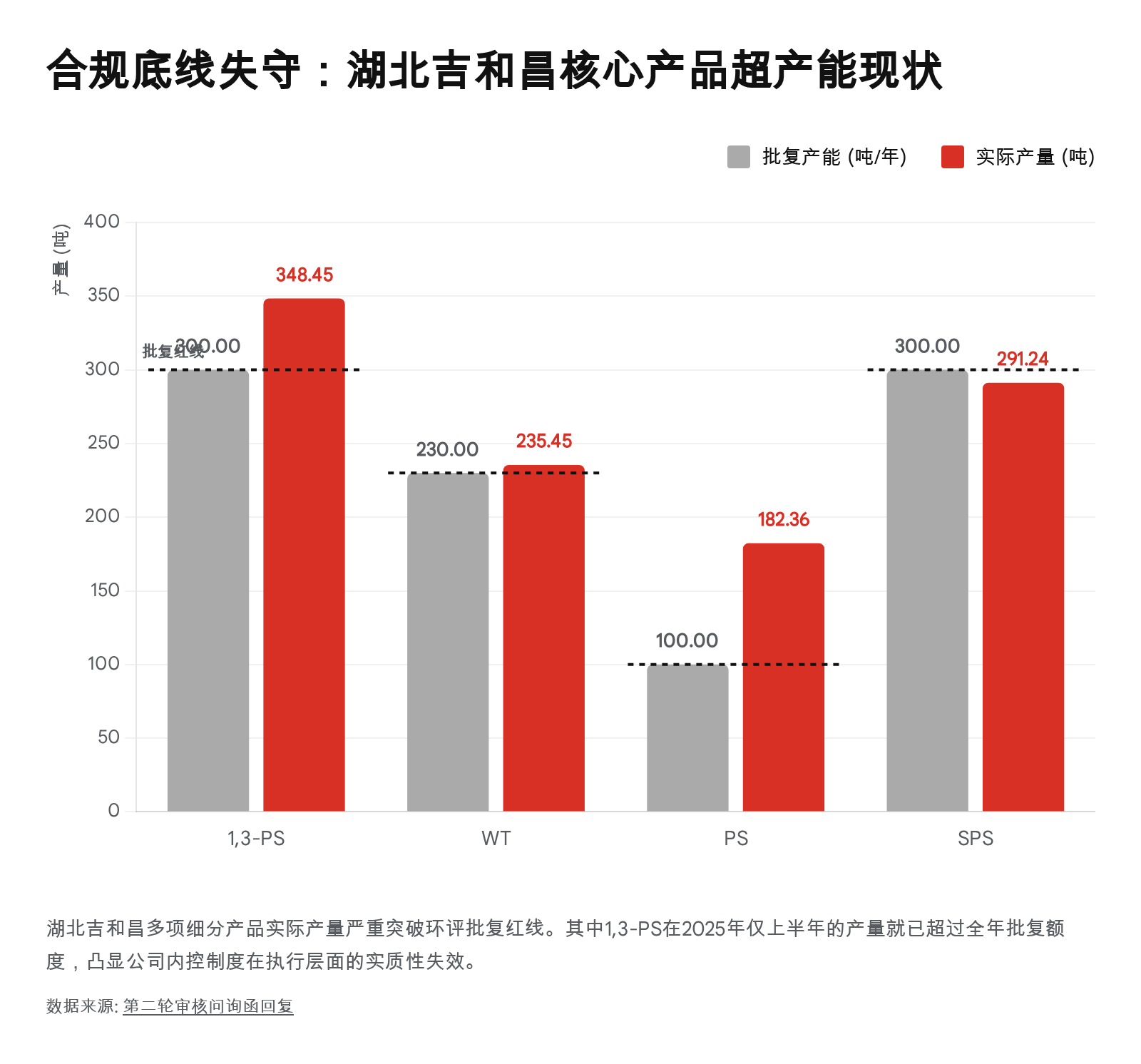 报告期内,吉和昌旗下的核心生产主体——湖北吉和昌、荆门吉和昌及武汉特化,均在不同阶段触碰了产能红线。湖北吉和昌在2022年不仅超产能,更存在超环评范围生产的情况;荆门吉和昌的SPS产品在2025年上半年的产能超标率亦达31.23%。