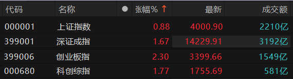 上证报中国证券网讯 4月10日,沪指盘中重回4000点,创业板指涨超2%。截至9时45分,沪指涨0.88%,报4000.90点,深证成指涨1.67%,创业板指涨2.30%,科创综指涨1.77%。证券、电池、玻璃玻纤、光伏设备等板块涨幅居前。