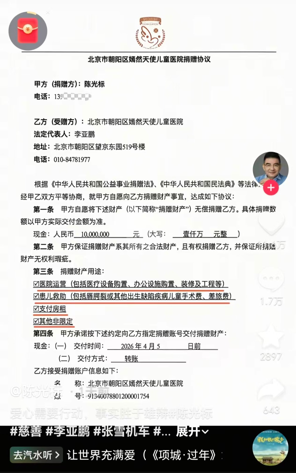 此前一天,陈光标在社交平台曾公布向嫣然儿童医院捐款的具体使用范围。捐赠协议第三条“捐赠财产用途”包括四项:可用于医院运营(包括医疗设备购置、办公设施购置、装修及工程等)、患儿救助(包括唇腭裂或其他出生缺陷疾病儿童手术费、差旅费)、支付房租及其他非限定性支出。