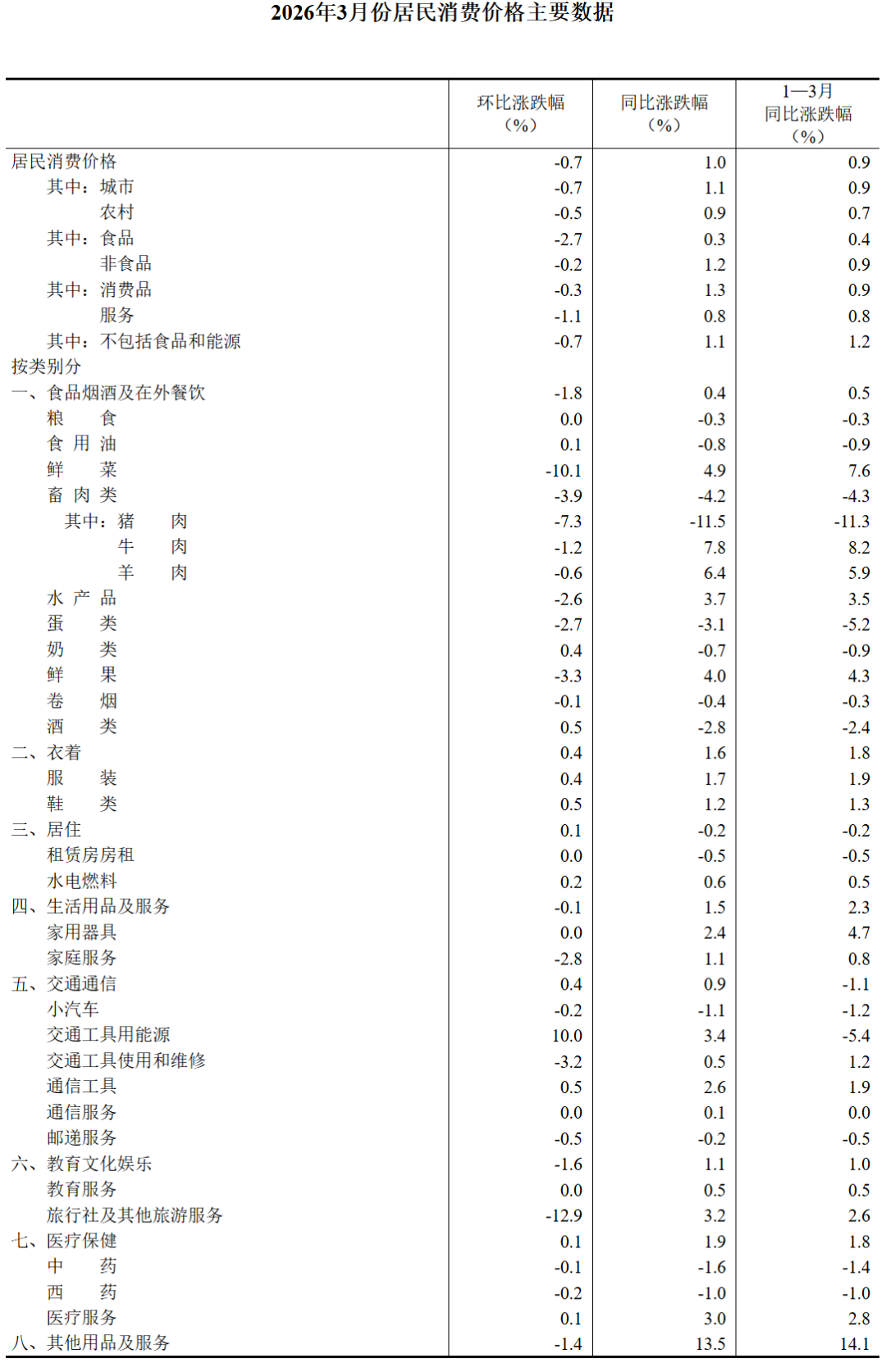 2026年3月份,全国居民消费价格同比上涨1.0%。其中,城市上涨1.1%,农村上涨0.9%;食品价格上涨0.3%,非食品价格上涨1.2%;消费品价格上涨1.3%,服务价格上涨0.8%。1—3月平均,全国居民消费价格比上年同期上涨0.9%。
