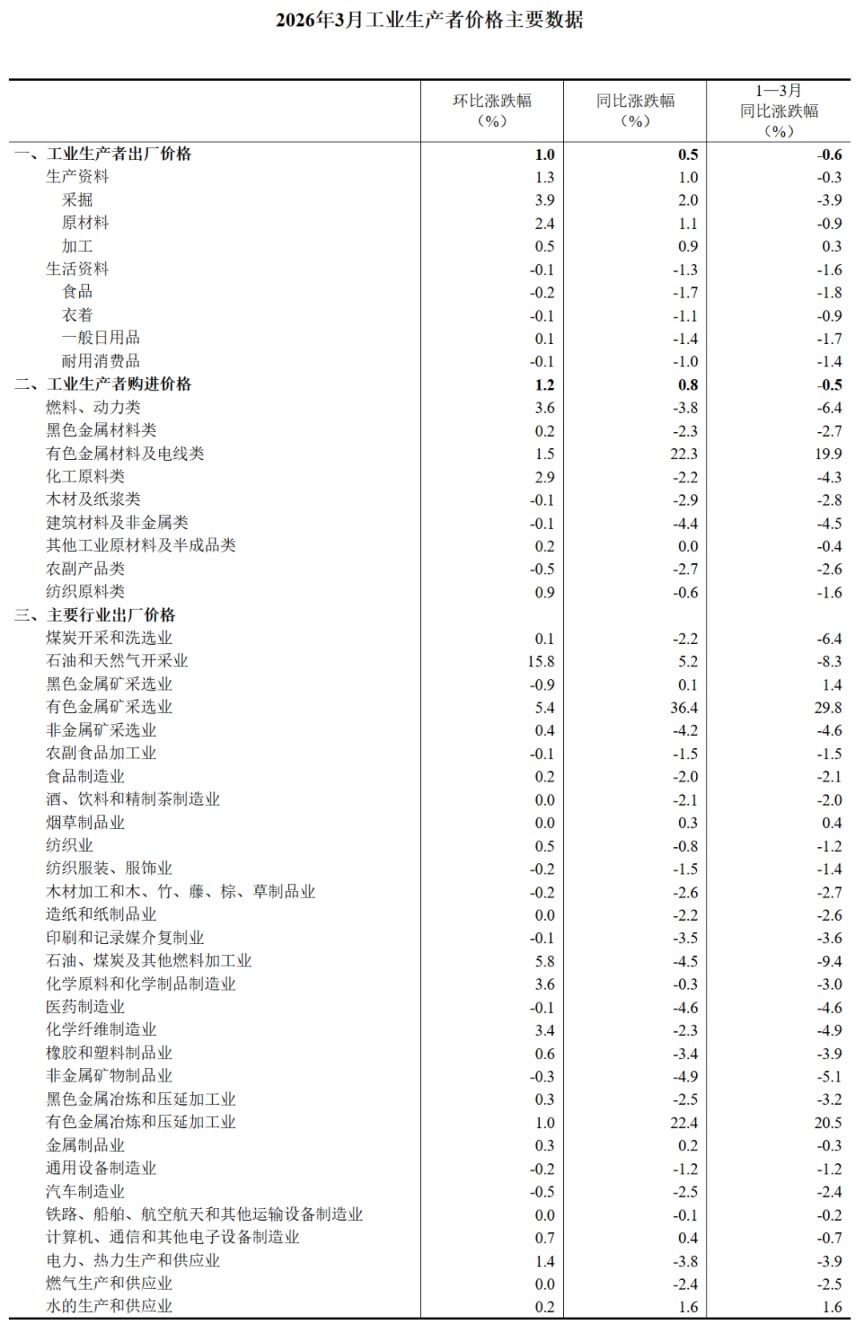 2026年3月份,全国工业生产者出厂价格同比由上月下降0.9%转为上涨0.5%;环比上涨1.0%,涨幅比上月扩大0.6个百分点。工业生产者购进价格同比由上月下降0.7%转为上涨0.8%;环比上涨1.2%,涨幅比上月扩大0.5个百分点。一季度,工业生产者出厂价格比上年同期下降0.6%,工业生产者购进价格下降0.5%。