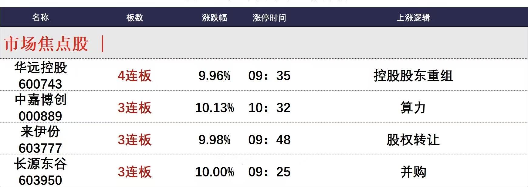 今日午盘全市场共48股涨停,连板股总数12只,23股封板未遂,封板率为68%(不含ST股、退市股)。焦点股方面,并购重组的华远控股4连板、长源东谷3连板,算力板块中嘉博创3连板,股权转让的来伊份3连板。