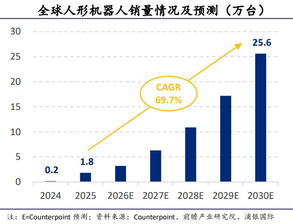 根据Counterpoint预测,到2030年,全球人形机器人的销量有望从2025年的1.8万台增长至2030年的25.6万台,复合增长率达69.7%。根据Omdia预测,全球人形机器人2035年出货量有望突破260万台,约为2025年出货的150倍。