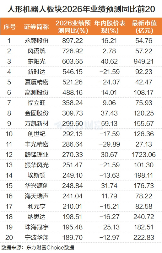 从股价表现来看,这部分业绩预测高增股,2026年以来整体好坏参半。其中东阳光、金固股份、万凯新材、赣锋锂业、华兴源创涨超30%;而新时达、夏厦精密、丰光精密、振华风光、珠海冠宇跌超20%。