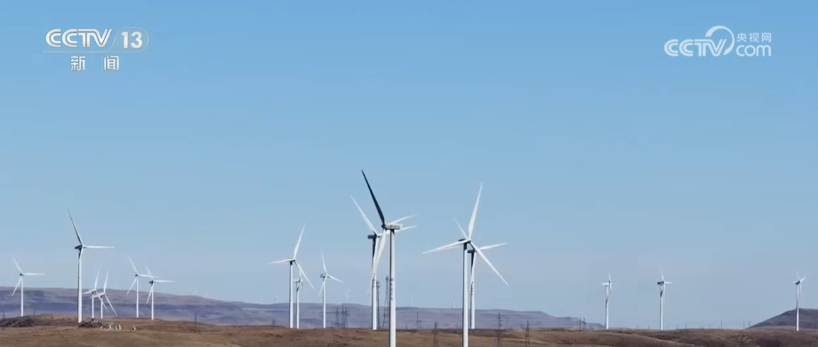 目前,整个园区共有30万千瓦的新能源装机。其中,风力发电是20万千瓦,光伏发电是10万千瓦。在整个山坡上共布设了26架风机,单个的高度就超过了120米。它们转一圈就能产生大约14度的绿电,在风力充沛的情况下,几秒钟就能转一圈。