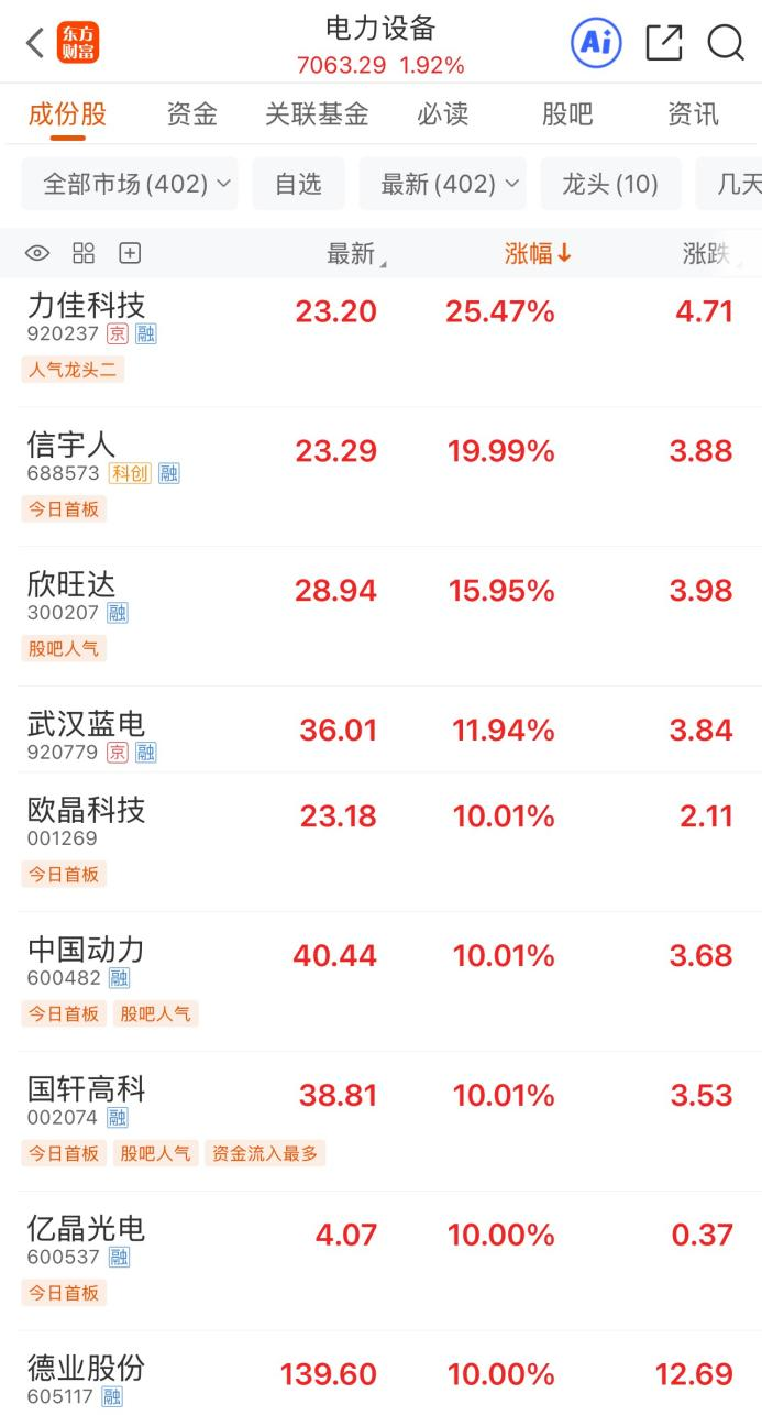 4月10日早盘,电力设备行业高开高走,截至早间收盘,板块上涨1.92%,涨幅居行业板块前列。个股掀起涨停潮,力佳科技暴涨25%,信宇人20CM涨停,欣旺达武汉蓝电涨超10%,欧晶科技、中国动力、国轩高科、亿晶光电、德业股份、中恒电气、福达合金、凯盛新能涨停,南都电源、圣阳股份等涨超9%。