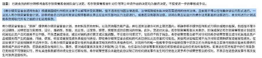 《希尔顿荣誉客会适用条款》则称,条款根据美国纽约州相关法律予以解释并受其限制,但不适用任何因法律选择、法律规则或条款冲突而需适用的他州法律。且索赔不得以任何集体诉讼的形式进行。一旦加入希尔顿荣誉客会计划,即表明会员已同意所有诉讼程序都将在弗吉尼亚州东部地区的法庭进行,或者若没有联邦法庭,则将在弗吉尼亚州的费尔法克斯县的法庭进行;希尔顿荣誉客会以“原样”提供希尔顿荣誉客会计划、本材料及其他材料,以及其他服务和产品,并在适用法律许可的上限范围内,明确申明不提供任何形式的明示或暗示担保。