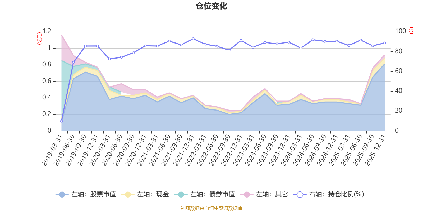 据定期报告数据统计,近三年平均股票仓位为88.2%,同类平均为72.57%。2021年末基金达到92.82%的最高仓位,2019年一季度末最低,为9.84%。