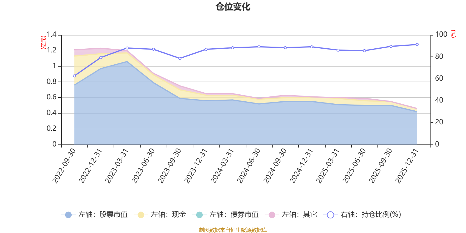 据定期报告数据统计,近三年平均股票仓位为87.37%,同类平均为84.04%。2025年末基金达到91.33%的最高仓位,2022年三季度末最低,为62.67%。