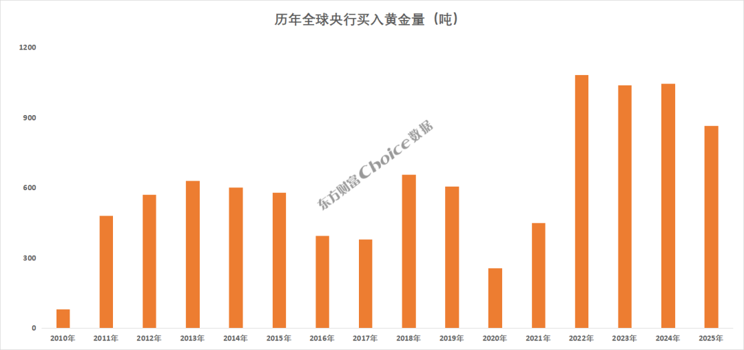 2025年,全球央行净买入黄金863吨,相比2024年减少17%,为2022年以来首次低于1000吨。