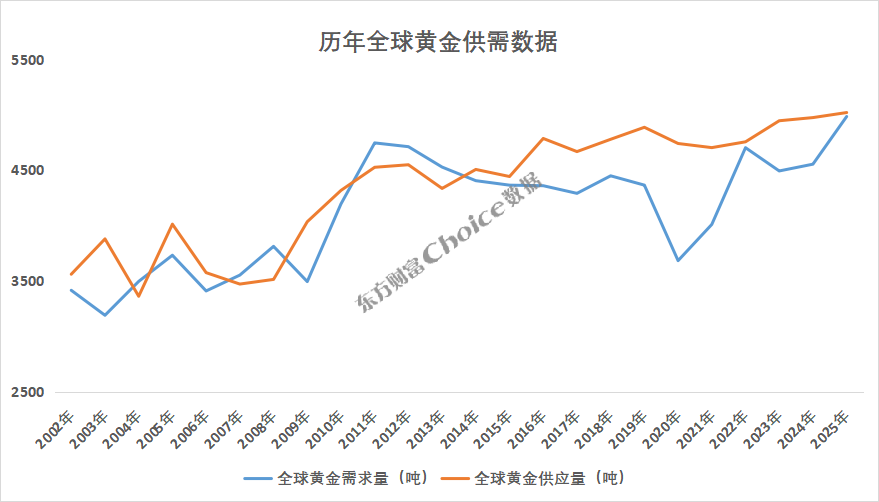 2020年全球黄金需求量3682吨,降至2010年以来最低点;2022年需求再次增至4702吨,2025年需求增至4984吨,需求量的增加推动黄金价格逐步走强。随着需求的上升,黄金供应量也逐步抬升,2025全球供应量突破5000吨。