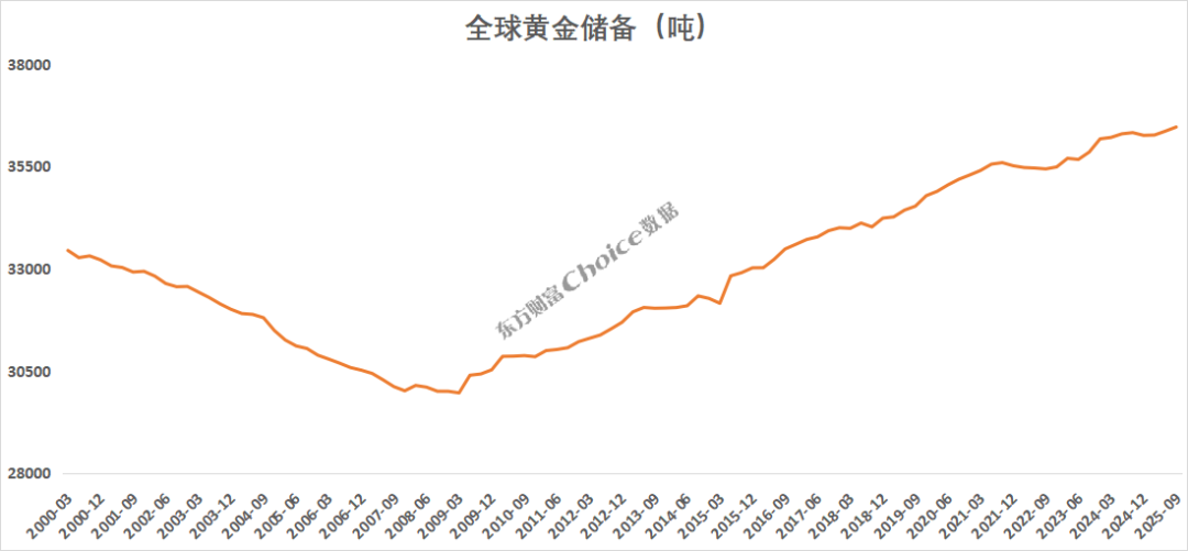 Choice数据显示,2022年以来,全球央行持续大规模买入黄金,连续三年超过1000吨。央行“购金热潮”使得全球央行黄金储备逐年增加,从2009年一季度末全球黄金储备降至不足3万吨,此后一路攀升,截至2025年三季度达到36458吨。
