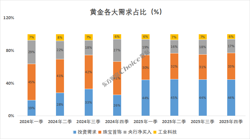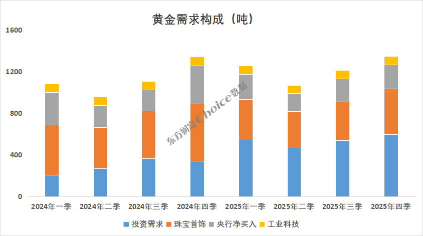 具体从需求构成来看,黄金的需求构成主要包括珠宝首饰、投资需求、工业科技需求和央行买入。2025年四季度投资需求595吨,占黄金总需求的比例44%;珠宝首饰需求量437吨,占比33%;央行买入量230吨,占比17%;工业科技需求82吨,占比6%。投资需求和珠宝首饰是黄金需求的主要来源,且投资需求持续增大,连续四个季度占比超40%。