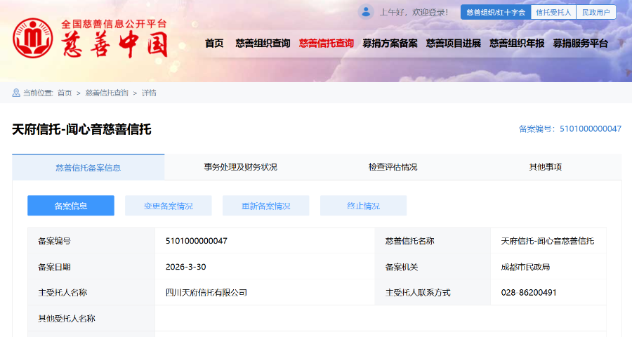 从公开披露的信息来看,此次备案是天府信托在公益慈善信托业务领域的首次探索。根据《中华人民共和国慈善法》及《慈善信托管理办法》的相关规定,信托公司应当在信托文件签订之日起7日内向民政部门完成备案。