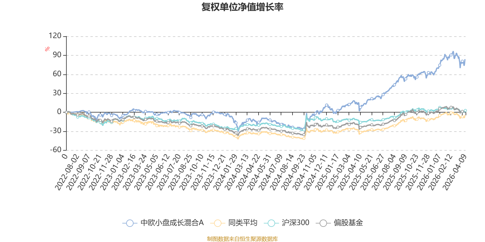 截至4月8日,中欧小盘成长混合A近三个月复权单位净值增长率为4.10%,位于同类可比基金143/621;近半年复权单位净值增长率为15.81%,位于同类可比基金51/621;近一年复权单位净值增长率为79.49%,位于同类可比基金71/618;近三年复权单位净值增长率为81.56%,位于同类可比基金23/559。