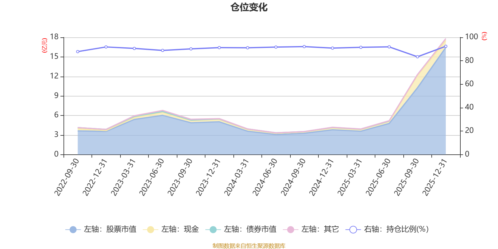 据定期报告数据统计,近三年平均股票仓位为90.48%,同类平均为85.83%。2025年末基金达到92.37%的最高仓位,2025年三季度末最低,为83.44%。
