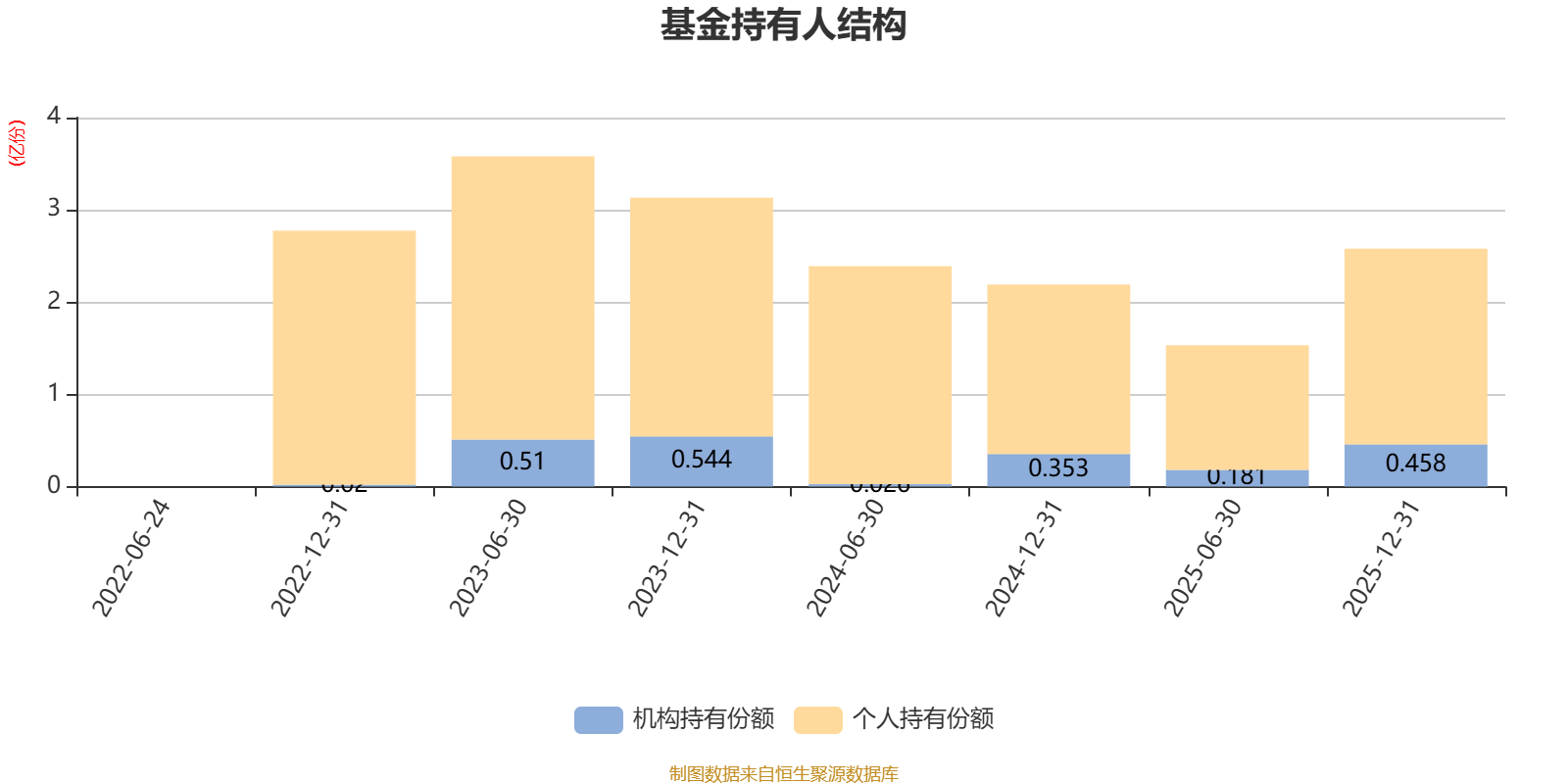 截至2025年12月31日,基金持有人共计2.27万户,合计持有2.58亿份。其中管理人员工持有366.59万份,占比1.42%,机构持有份额占比17.76%,个人投资者占比82.24%。