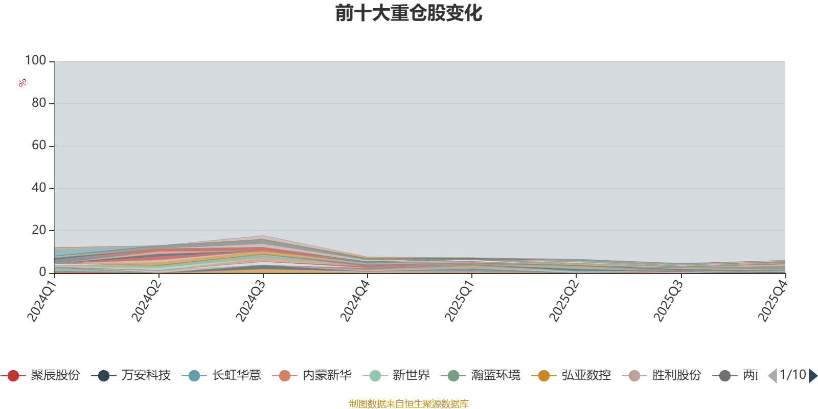 截至2025年末,基金十大重仓股分别是杭州解百、万安科技、泰胜风能、中天科技、天虹股份、苏试试验、新世界、千禾味业、海特高新、航发科技。