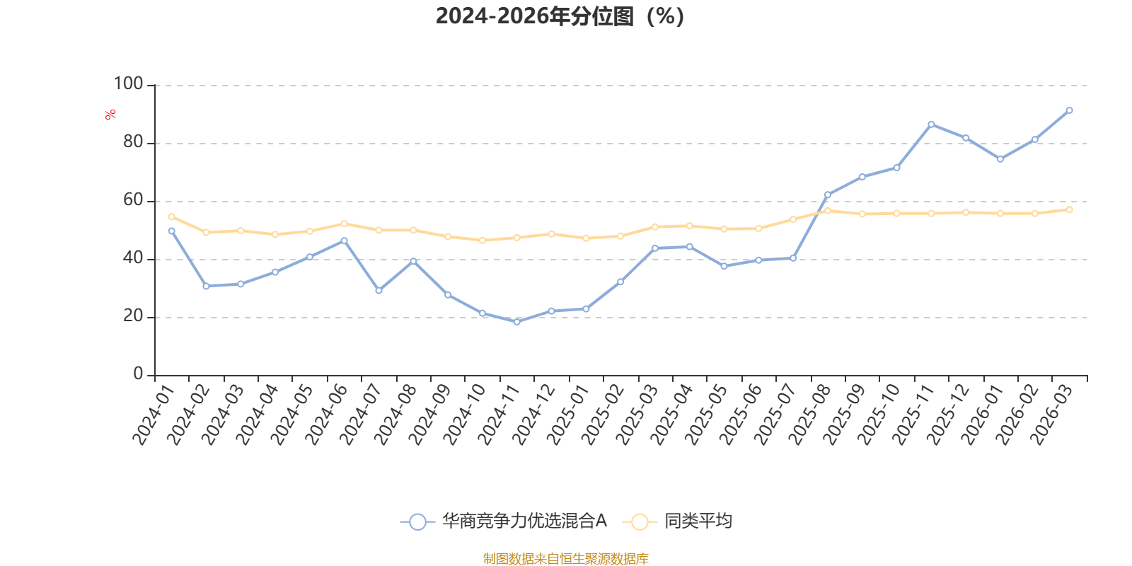 通过所选区间该基金净值增长率分位图,可以观察该基金与同类基金业绩比较情况。图为坐标原点到区间内某时点的净值增长率在同类基金中的分位数。