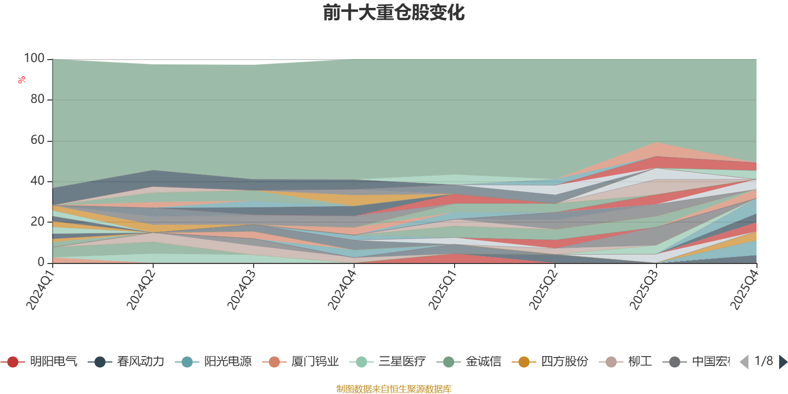 截至2025年末,基金十大重仓股分别是宁德时代、阳光电源、天赐材料、华友钴业、多氟多、四方股份、诺德股份、国城矿业、金风科技、春风动力。