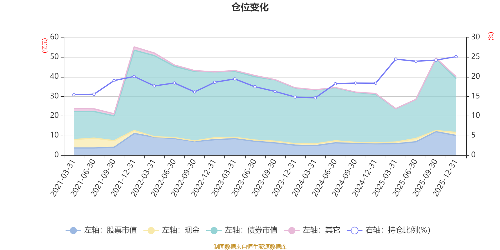 据定期报告数据统计,近三年平均股票仓位为19.61%,同类平均为19.2%。2025年末基金达到25.11%的最高仓位,2024年一季度末最低,为14.61%。
