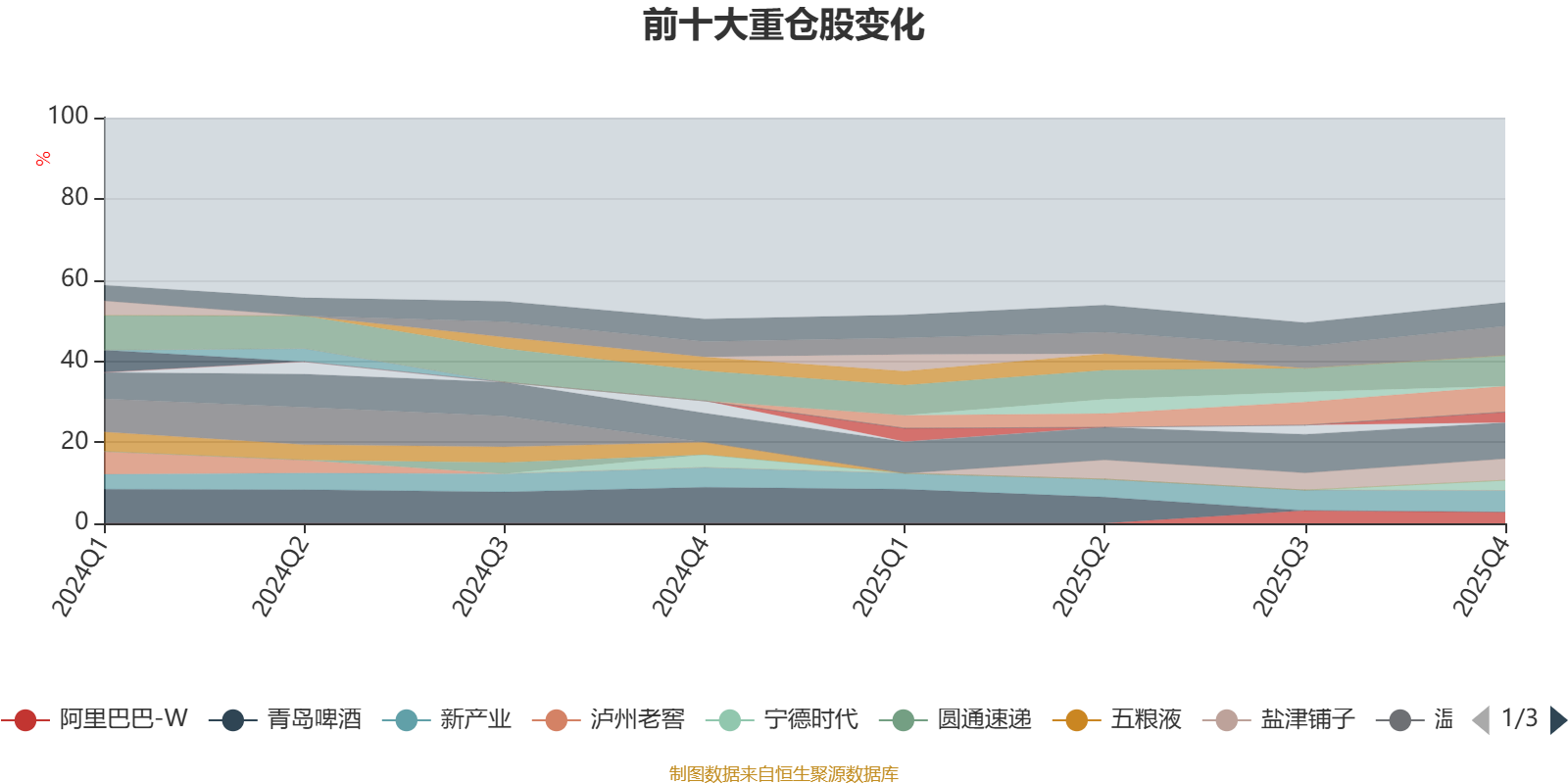 截至2025年末,基金十大重仓股分别是石头科技、贵州茅台、继峰股份、腾讯控股、惠泰医疗、新产业、盐津铺子、阿里巴巴-W、吉利汽车、宁德时代。