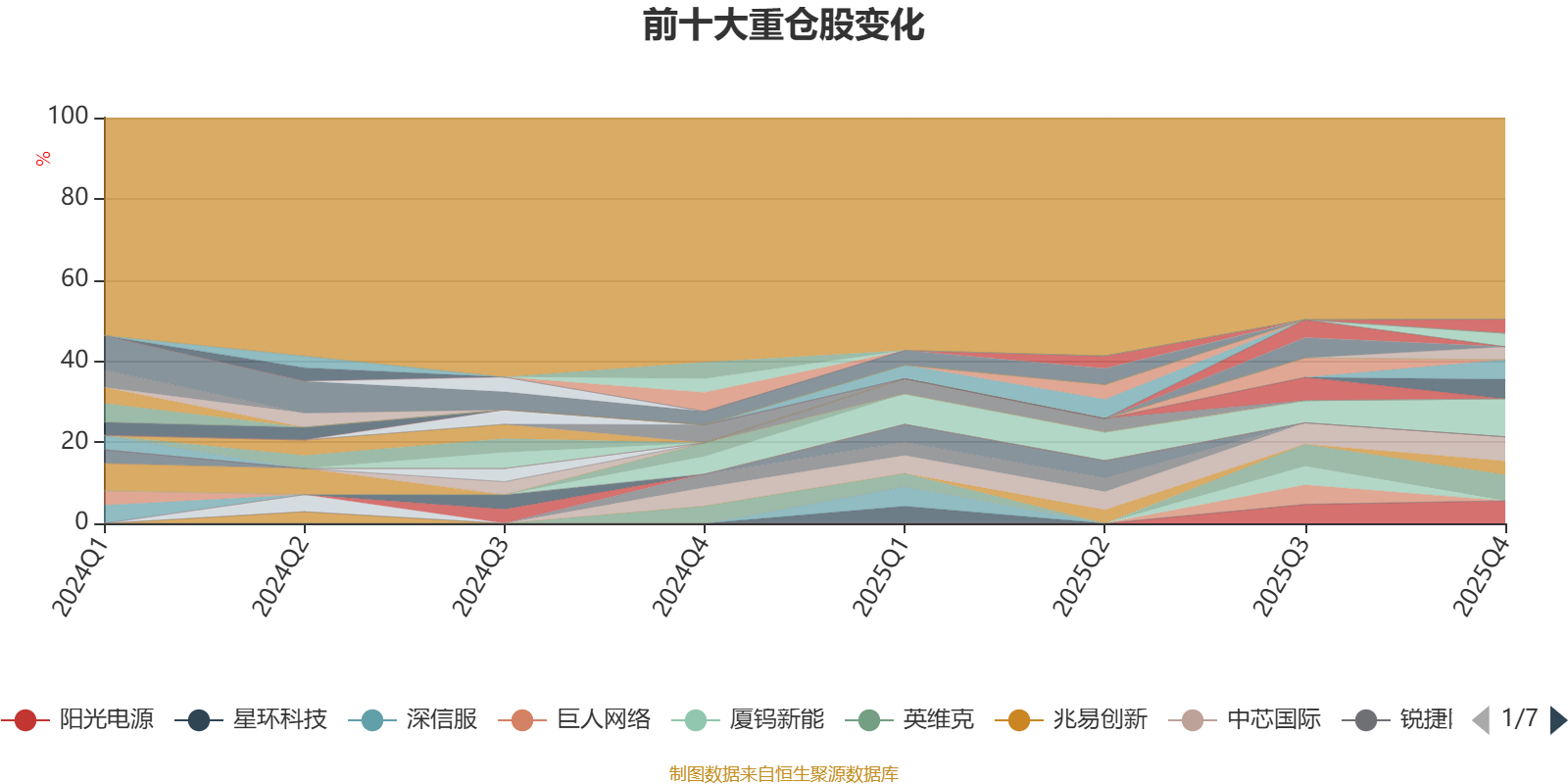 截至2025年末,基金十大重仓股分别是寒武纪、英维克、中芯国际、阳光电源、宁德时代、思源电气、中际旭创、兆易创新、海康威视、江西铜业。