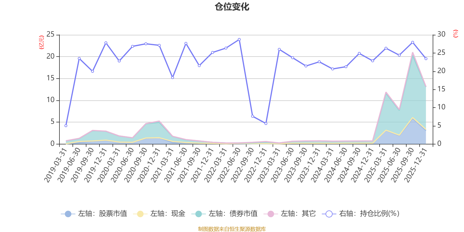 据定期报告数据统计,近三年平均股票仓位为23.78%,同类平均为19.2%。2022年上半年末基金达到28.72%的最高仓位,2019年一季度末最低,为5.03%。
